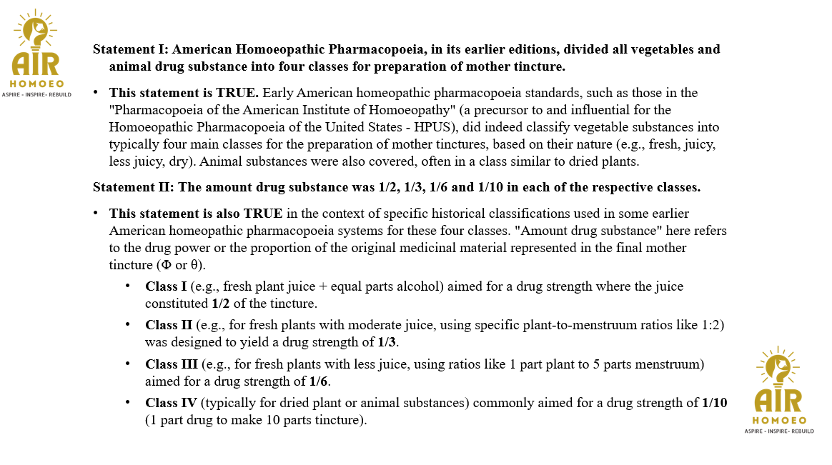 Statement | : American Homoeopathic Pharmacopoeia, in it‘s earlier editions, divided all vegetables and animal drug substance into four classes for preparation of mother tincture.