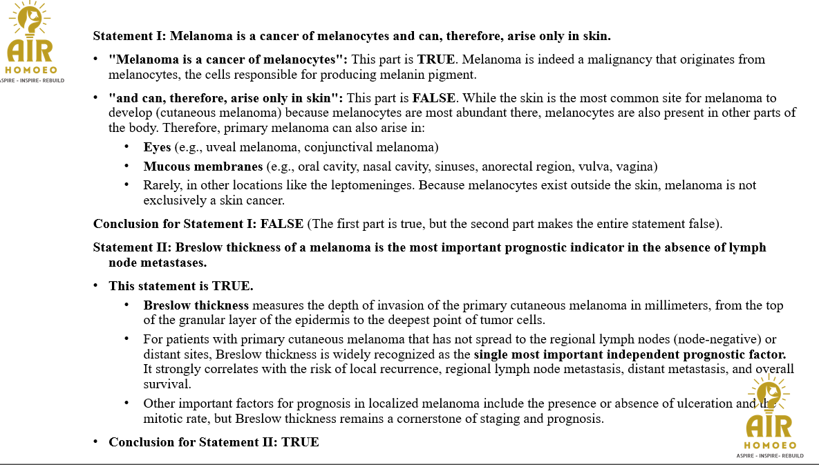 Statement | : Melanoma is a cancer of melanocytes and can, therefore, arise only in skin.