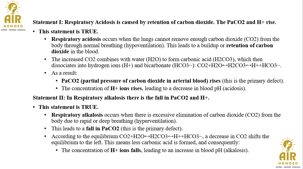 Statement! : Respiratory Acidosis is caused by retention of carbon dioxide. The PaCO, and H* rise.