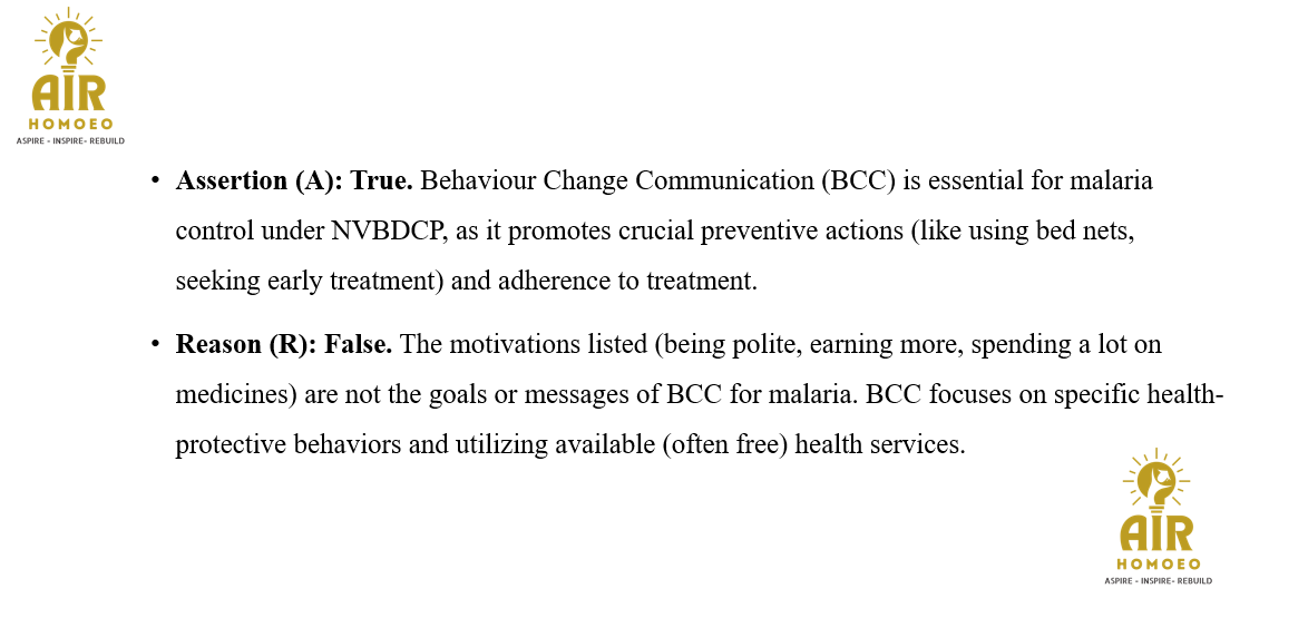 Assertion (A):BEHAVIOUR CHANGE COMMUNICATION IS KEY SUPPORTIVE STRATEGY FOR MALARIA PREVENTION AND TRETAMENT UNDER NVBDCP