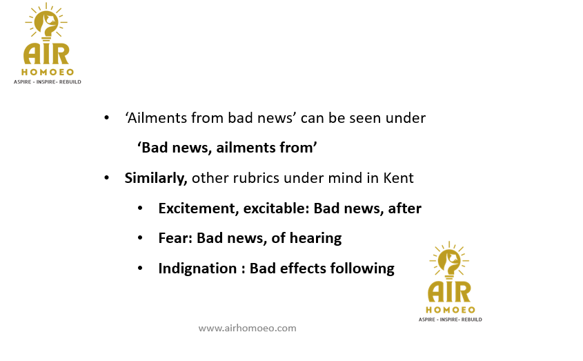 In Kent’s Repertory, the complaint “Ailments from bad news” can be located in the