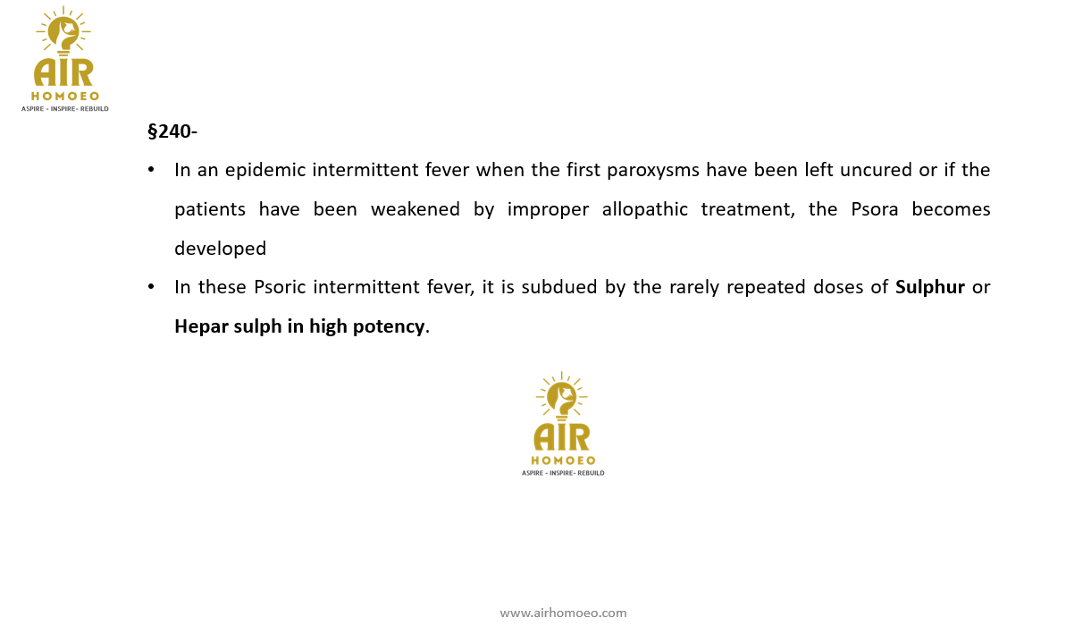 Reason R: In these Psoric intermittent fever, it is subdued by the rarely repeated doses of Sulphur or Hepar sulph in high potency.