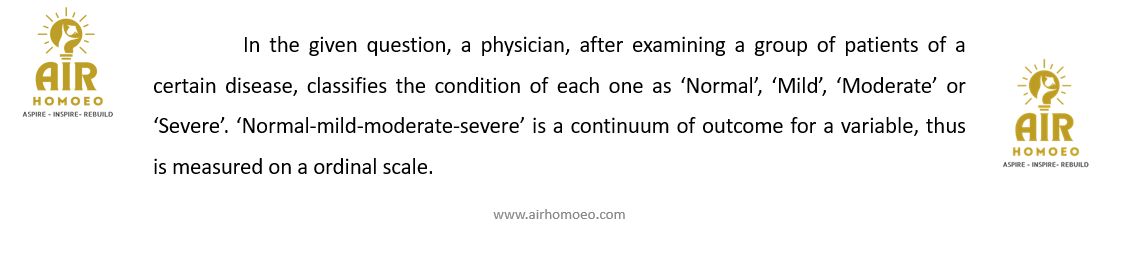 A physician, after examining a group of patients of a certain disease, classifies the condition of each one as ‘Normal’, ‘Mild’, ‘Moderate’ or ‘Severe’. Which one of the following is the scale of measurement that is being adopted for classification of the disease condition?