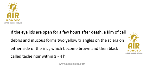 Tache noir (French for “black spot”) is a post-mortem sign that appears as a reddish-brown to black band or spot on the sclera (the white part of the eye). It is caused by the drying and desiccation of the exposed sclera when the eyelids are not fully closed after death. The exposed tissue becomes covered in dust and dried epithelial cells, and the color change is due to the oxidation of hemoglobin. It typically begins to appear a few hours after death and is an early indicator of the post-mortem interval.