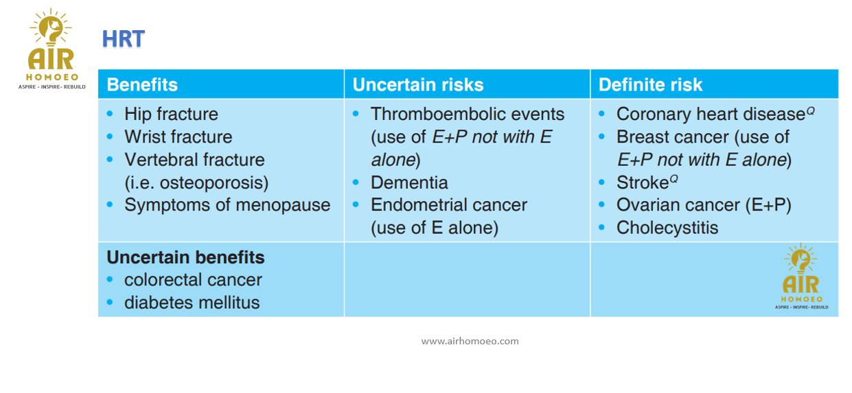 Contraindications to HRT: 1)undiagnosed genital tract bleeding