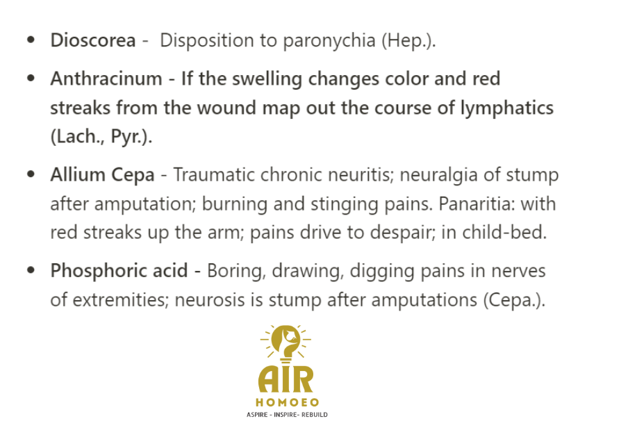Panaritia: with red streaks up the arm; pains drive to despair; in child-bed.