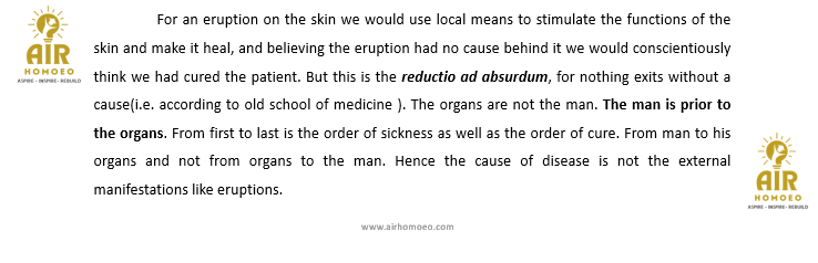 Assertion A: For an eruption on the skin we would use local means to stimulate the functions of the skin and make it heal, and believing the eruption had no cause behind it .