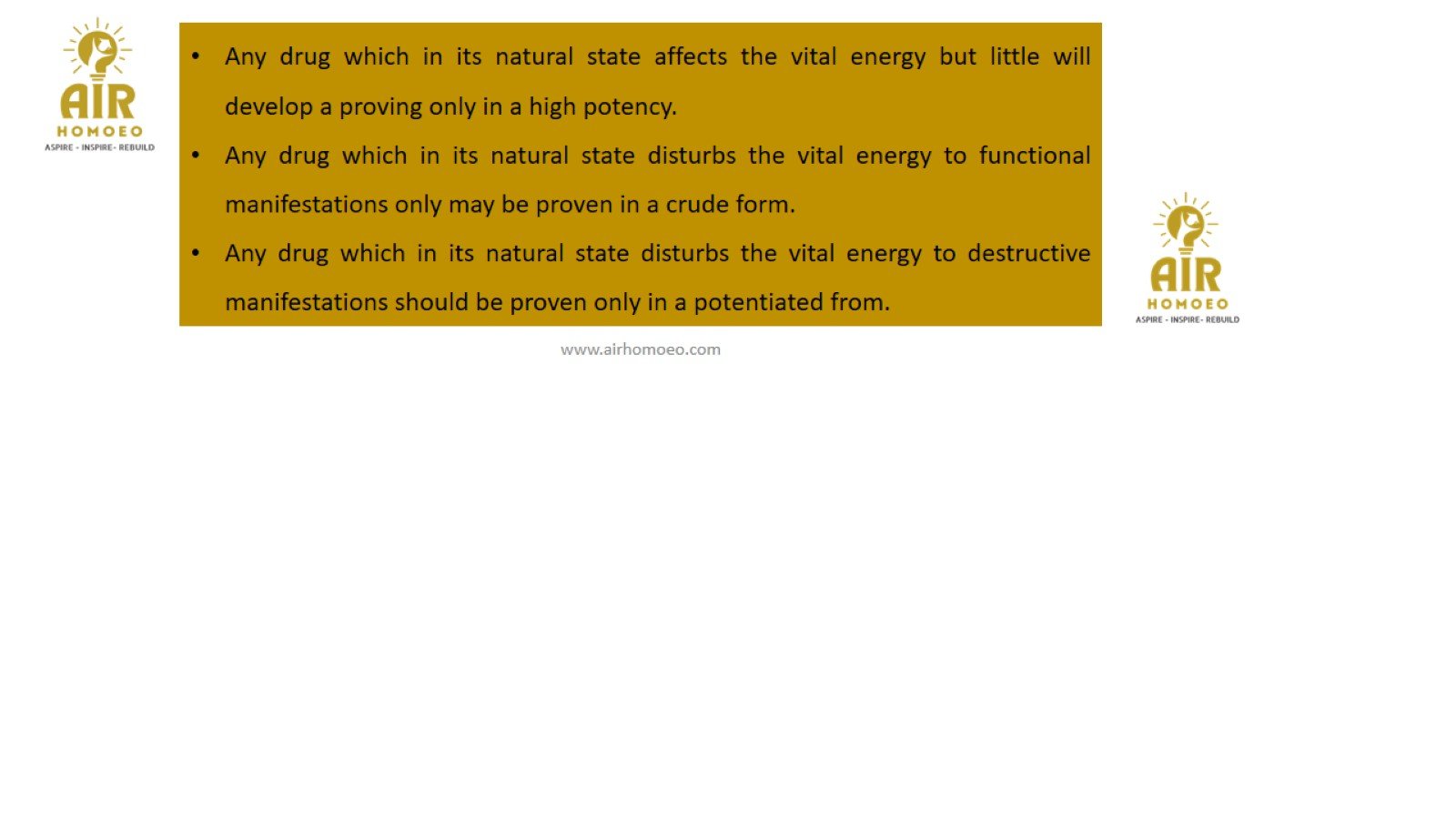 Statement I: Any drug which in its natural state disturbs the vital energy to functional manifestations only may be proven in a crude form.