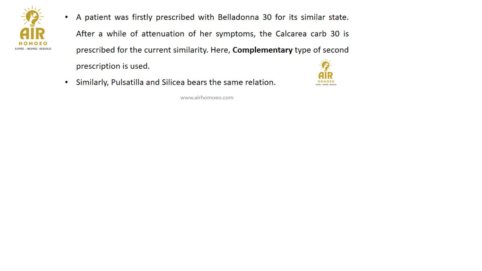 A patient was firstly prescribed with Belladonna 30 for its similar state. After a while of attenuation of her symptoms, the Calcarea carb 30 is prescribed for the current similarity. Here, ___ type of second prescription is used.