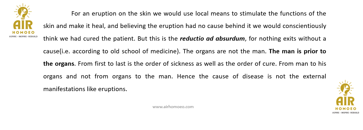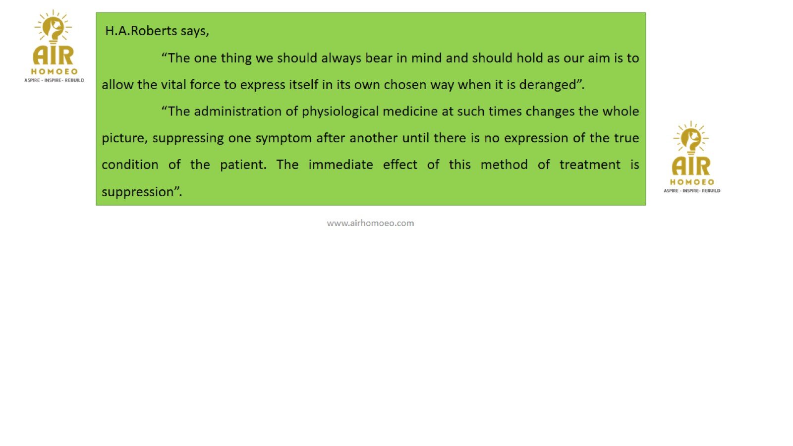 Reason R: The administration of physiological medicine at such times changes the whole picture, suppressing one symptom after another until there is no expression of the true condition of the patient.