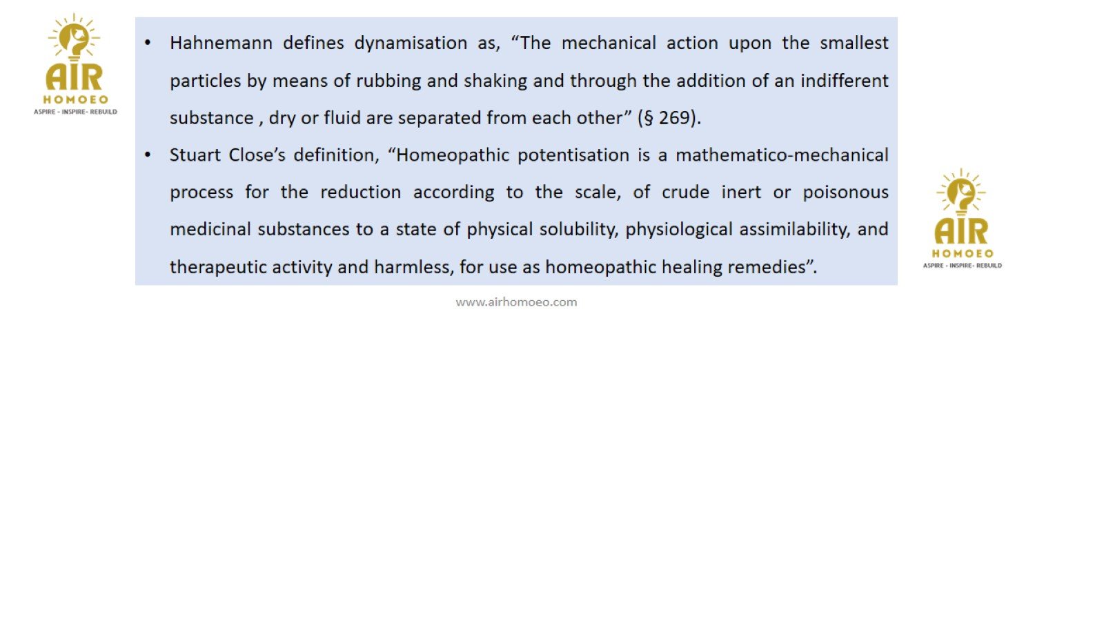 Homeopathic potentisation is a mathematico-mechanical process for the reduction according to the scale, of crude inert or poisonous medicinal substances to a state of physical solubility, physiological assimilability, and therapeutic activity and harmless, for use as homeopathic healing remedies”- is stated by,
