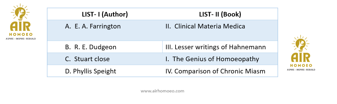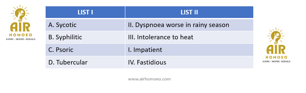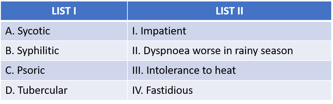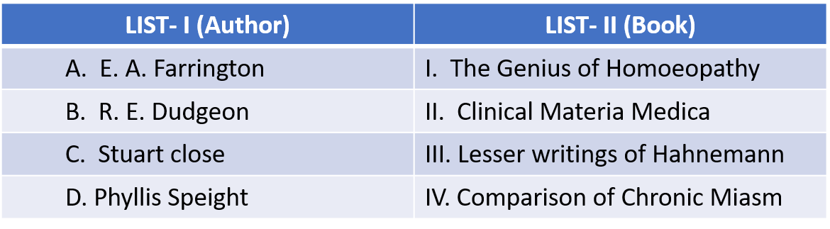 Match the list I with list II and select the correct answer from the options given below:
