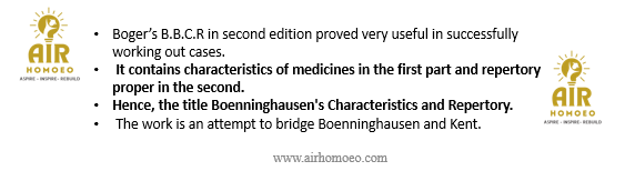 Reason (R):The 1st part and 2nd part arrangement is the reason for the title Boenninghausen‘s Characteristics and Repertory