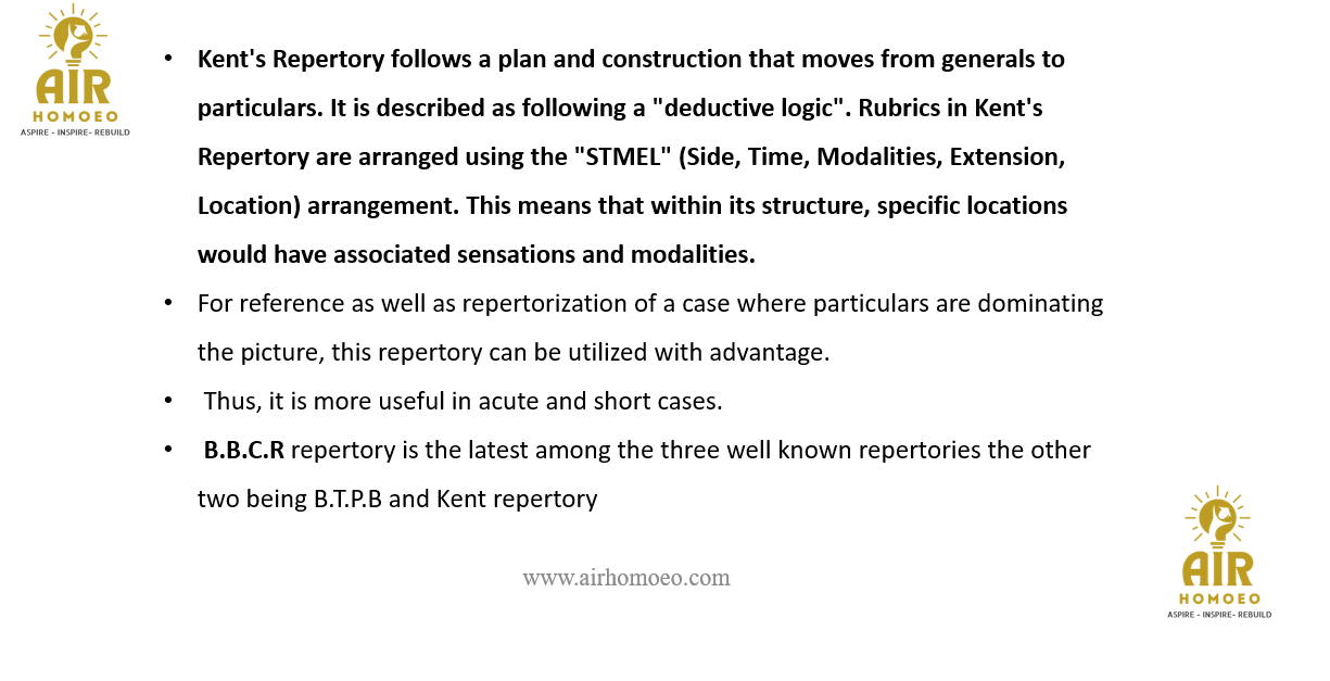 Reason (R): Kent repertory is the latest among the three well known repertories the other two being B.T.P.B and B.B.C.R repertory