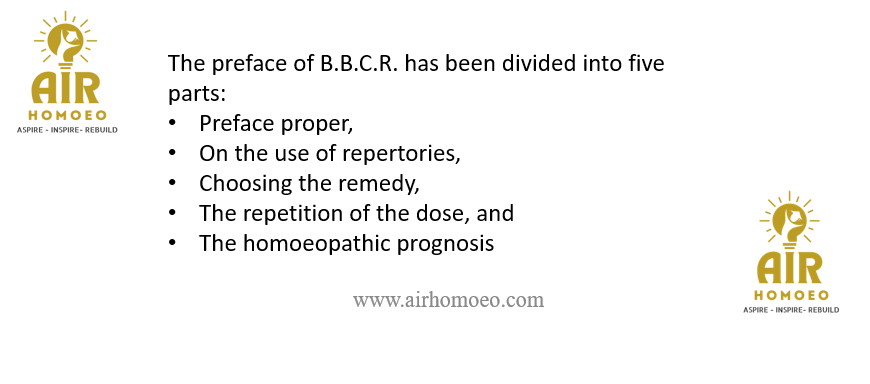 Assertion (A):In B.B.C.R it Contains Characteristics of Medicines in the First part and Repertory proper in Second part
