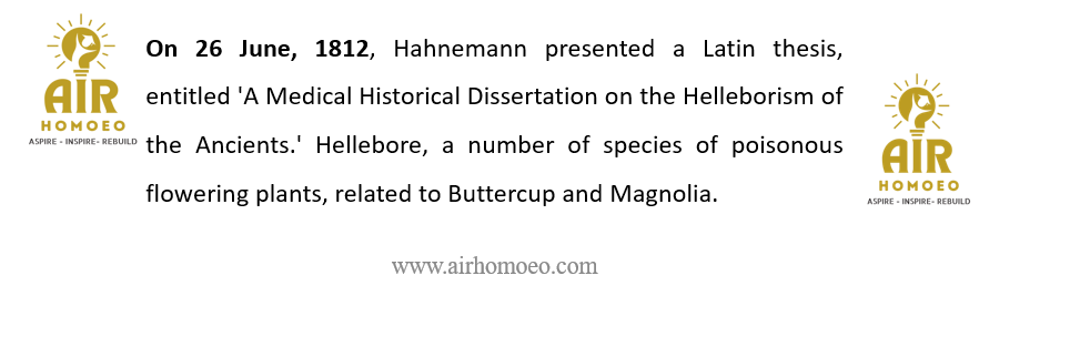Hahnemann presented a Latin thesis, entitled ‘A Medical Historical Dissertation on the Helleborism of the Ancients.‘ In the year